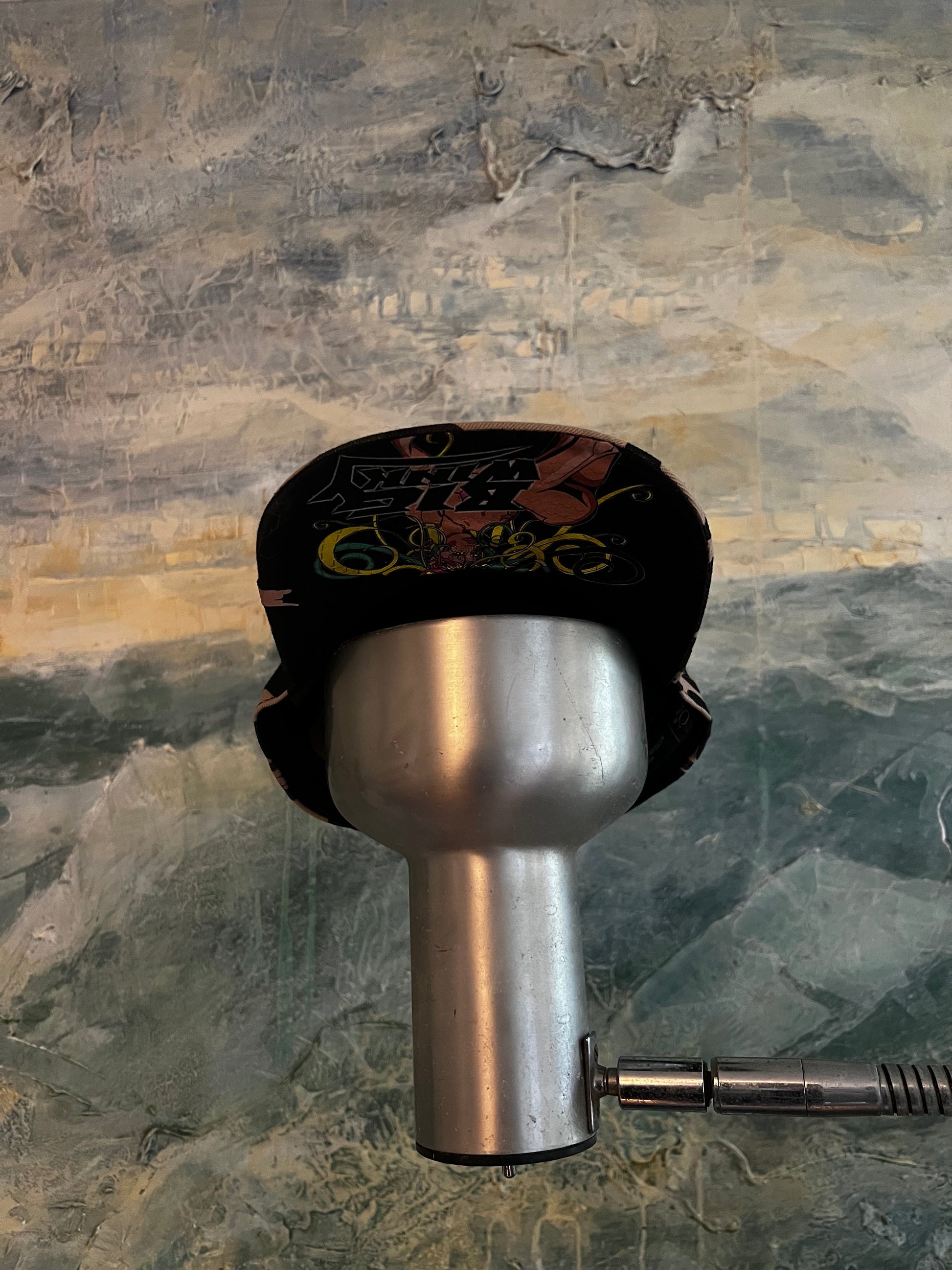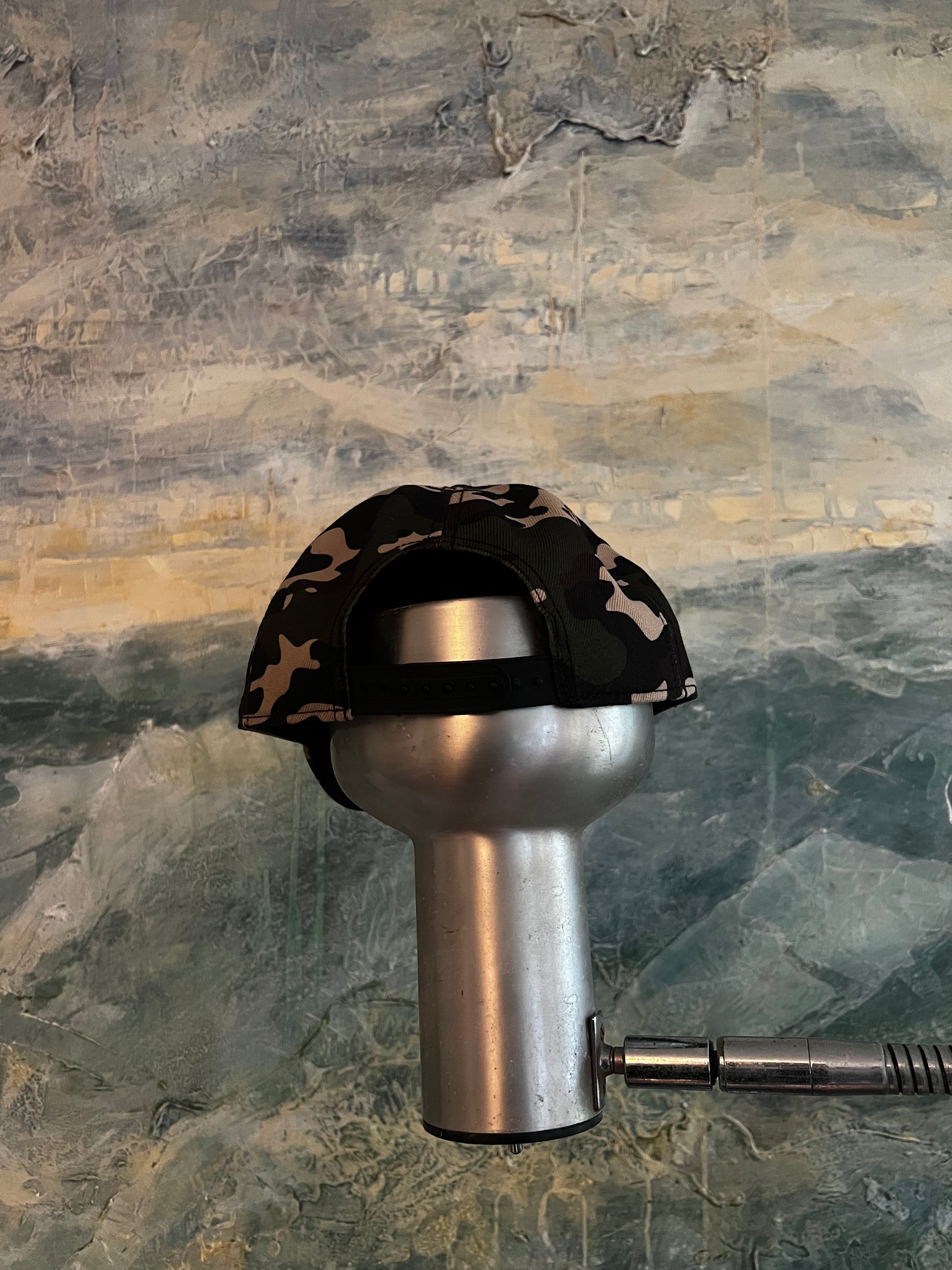 Camo snapback, with Miss. Big Winky's hand-drawn illustrations, hand-printed flowing from the front panel onto the peak and underside, making it a bold statement piece.