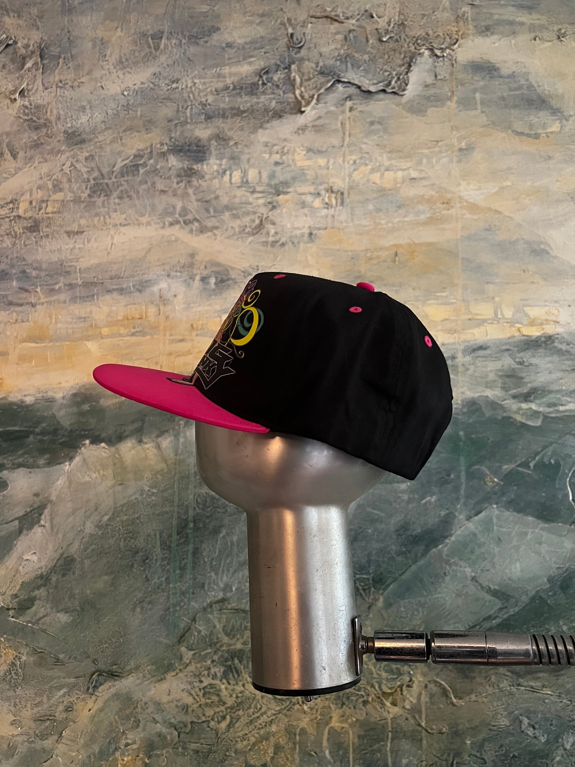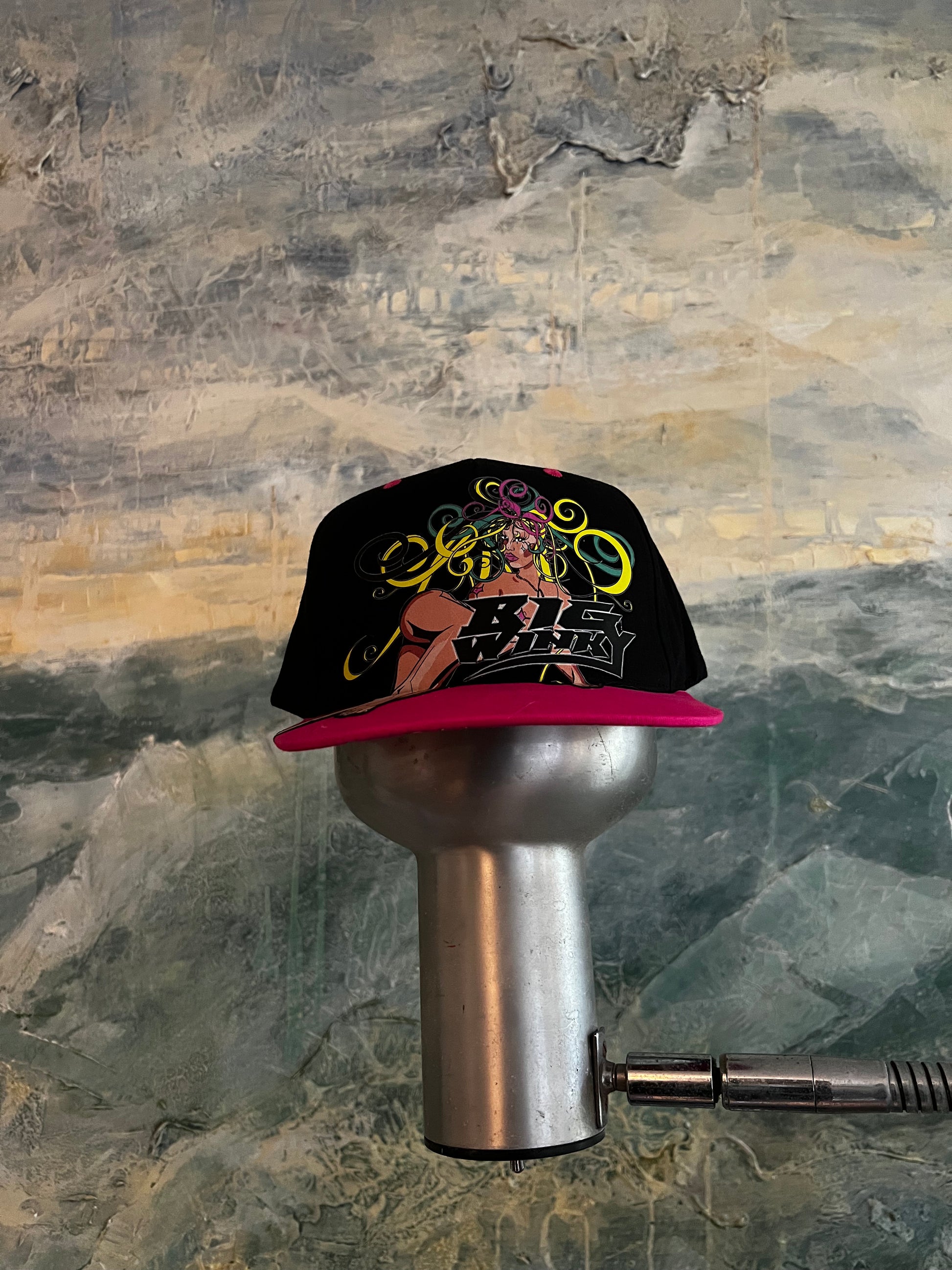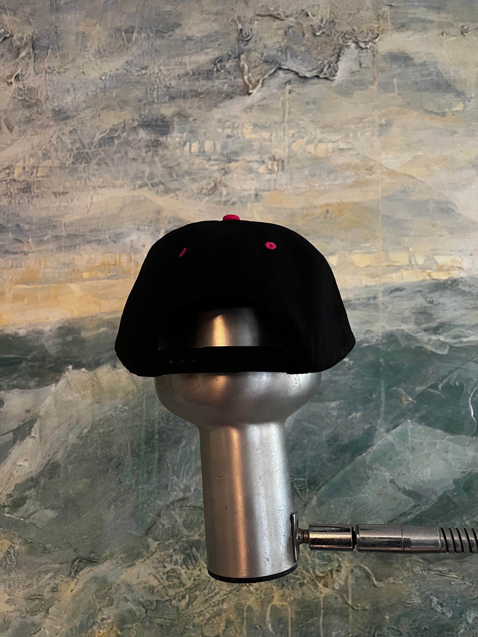 Pink Baseball Cap, with Miss. Big Winky's hand-drawn illustrations, hand-printed flowing from the front panel onto the peak and underside, making it a bold statement piece.