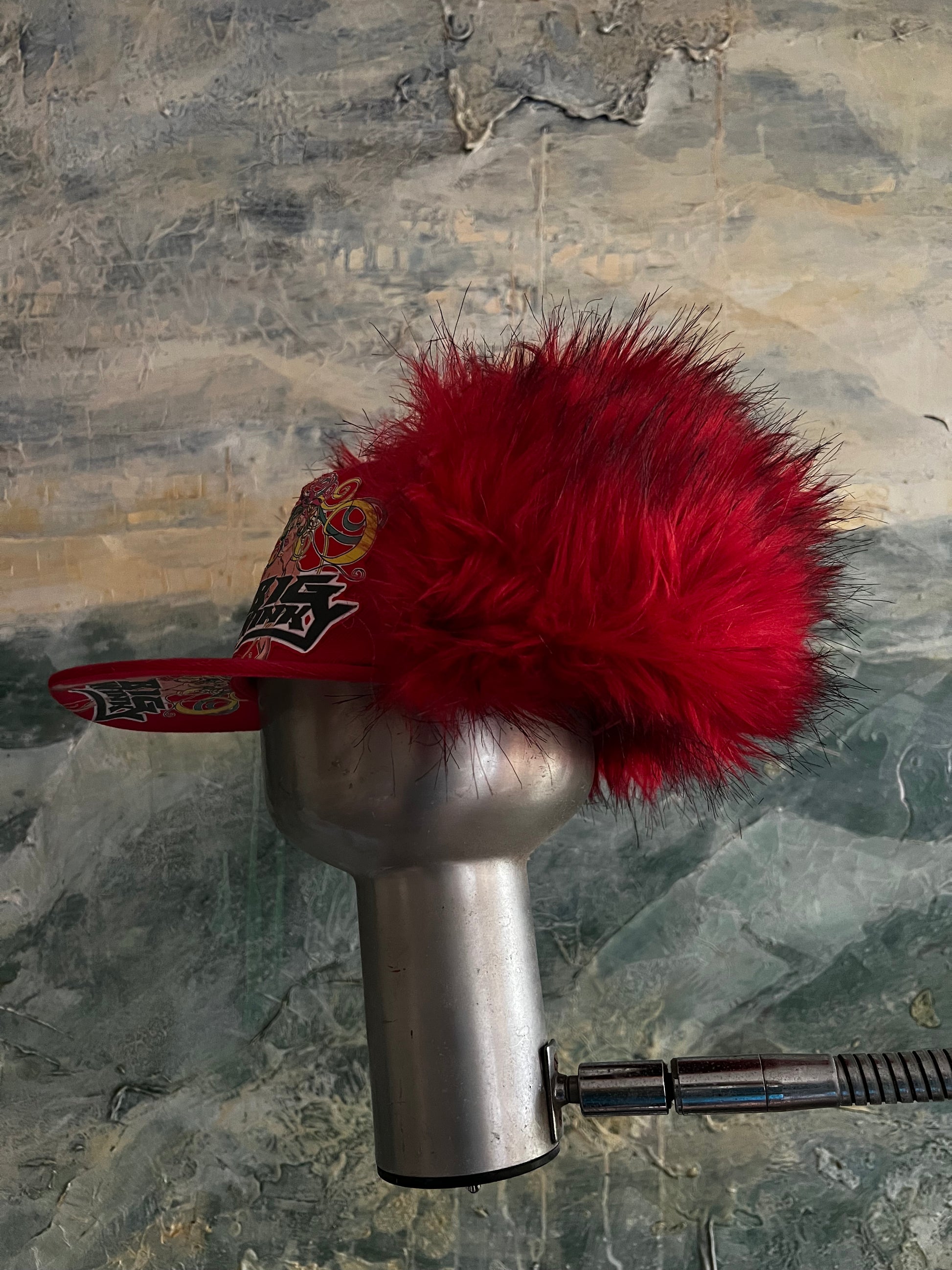 Handmade fur snapback, featuring plush red and a fresh, hand-drawn, hand-printed illustration by Miss. Big Winky, that flows from the front panel onto the peak and underside, making it a bold statement piece.